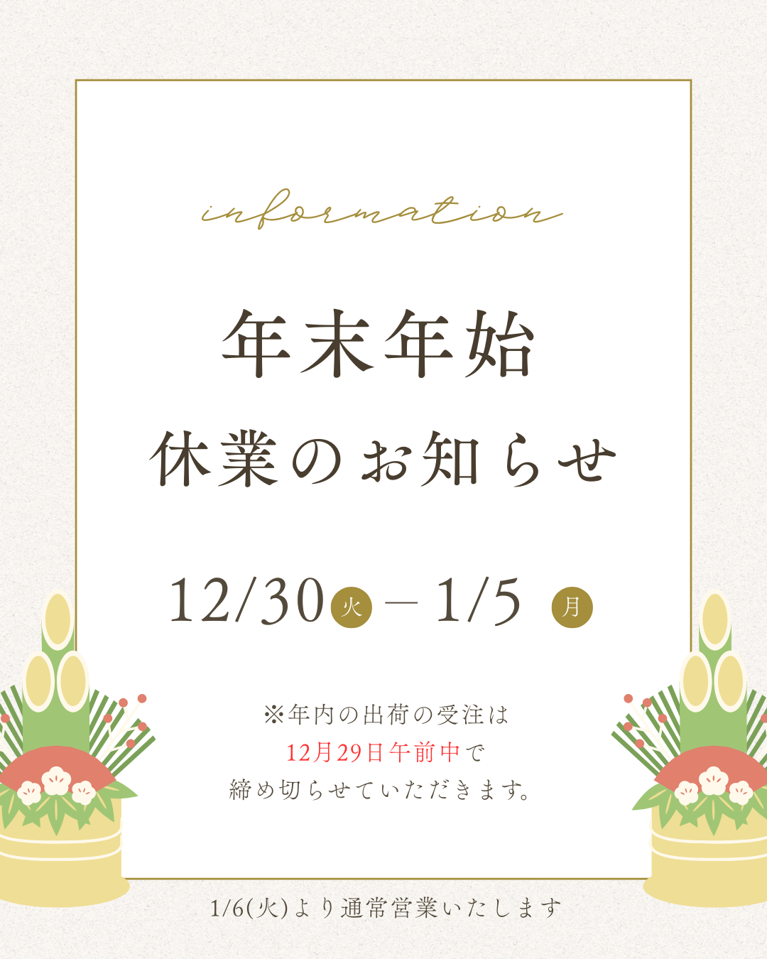 年末年始休業のご案内です いつもプラネットの商品をご愛顧頂きありがとうございます。 年末年始休業日:12月30日~1月5日 ※12月29日の営業時間は18時迄。 1月6日より通常営業となります。 皆様には大...続きを読む