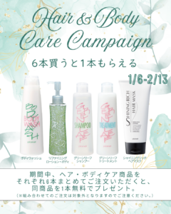 ヘア・ボディケア商品をそれぞれ6本まとめてご注文いただくと、同商品を1本無料でプレゼント!!